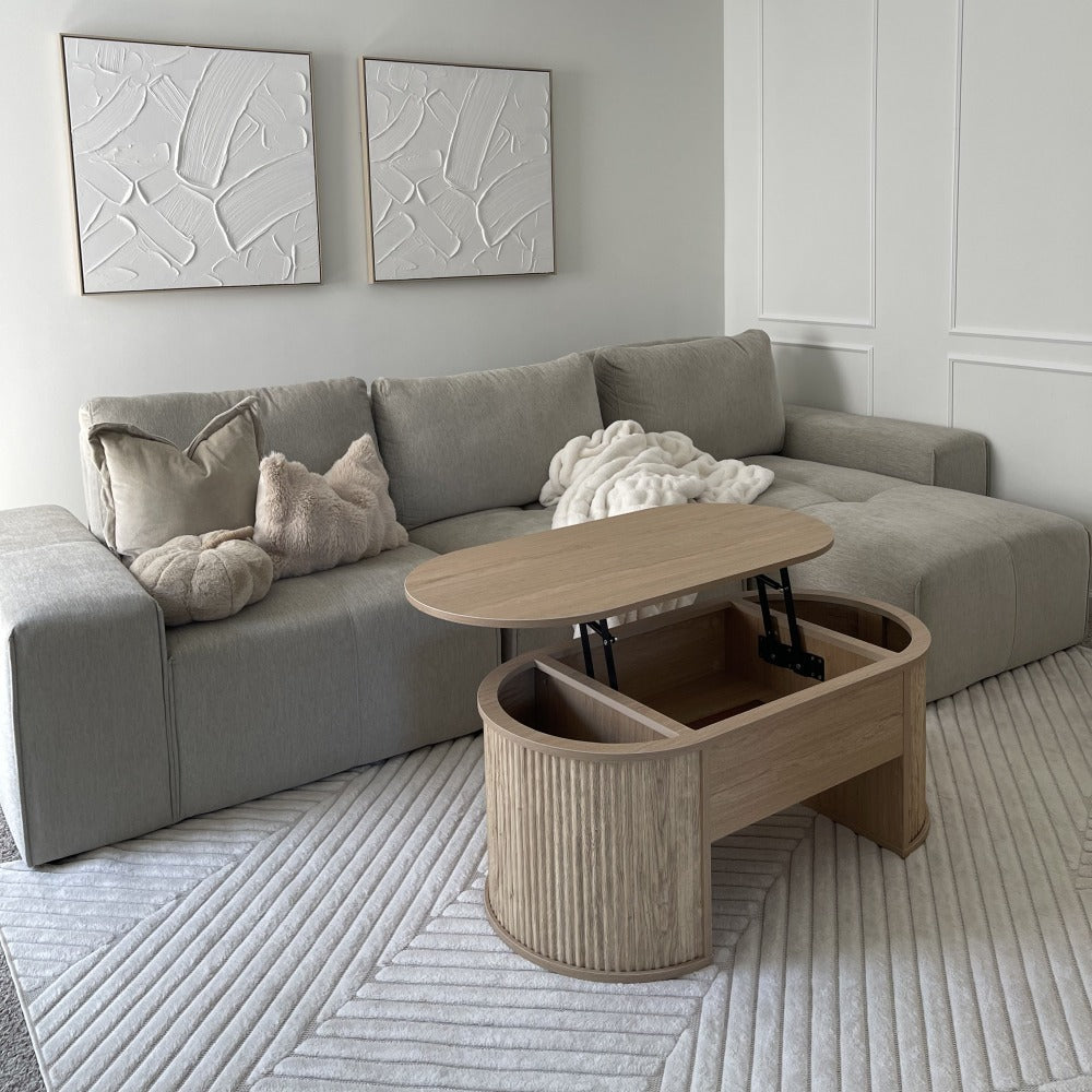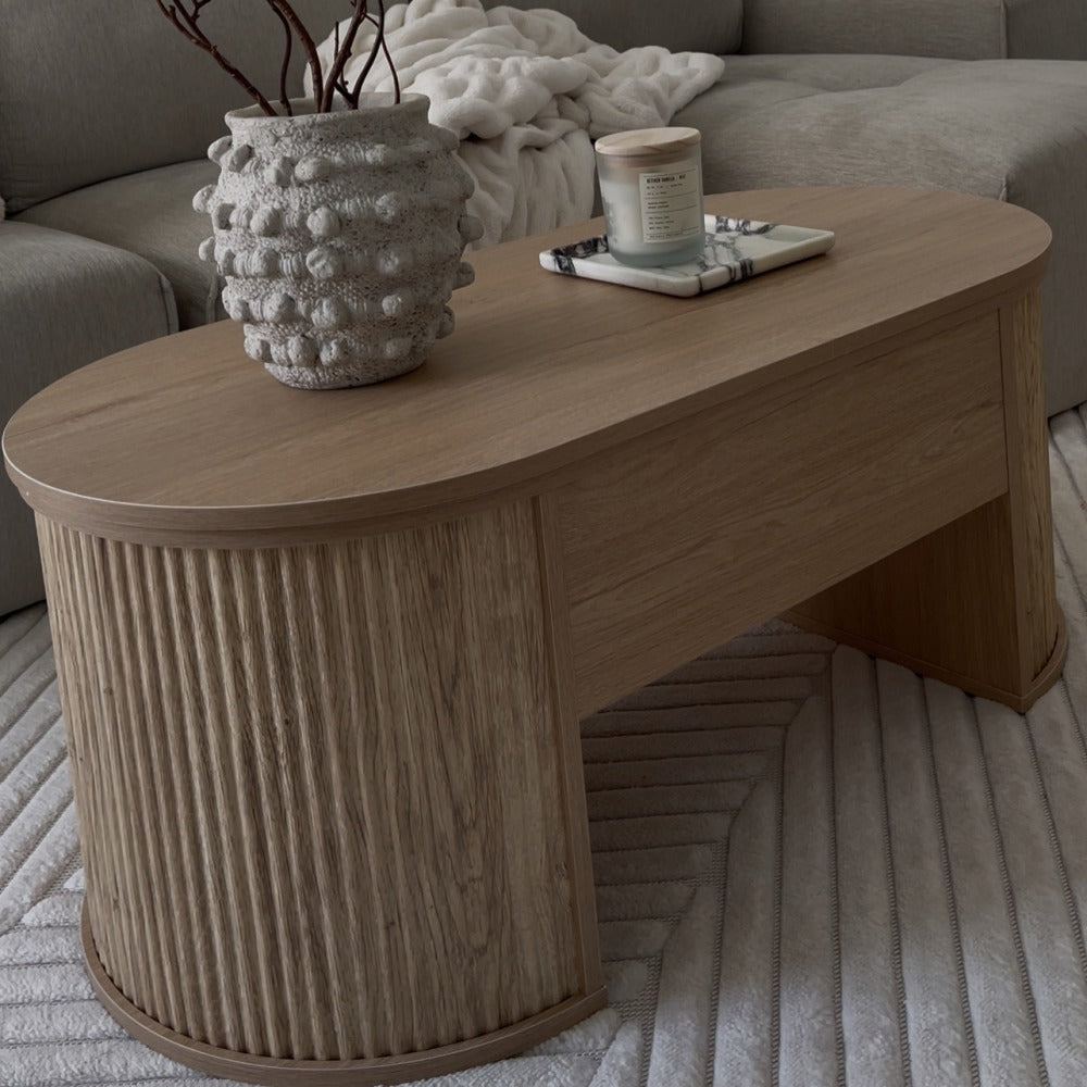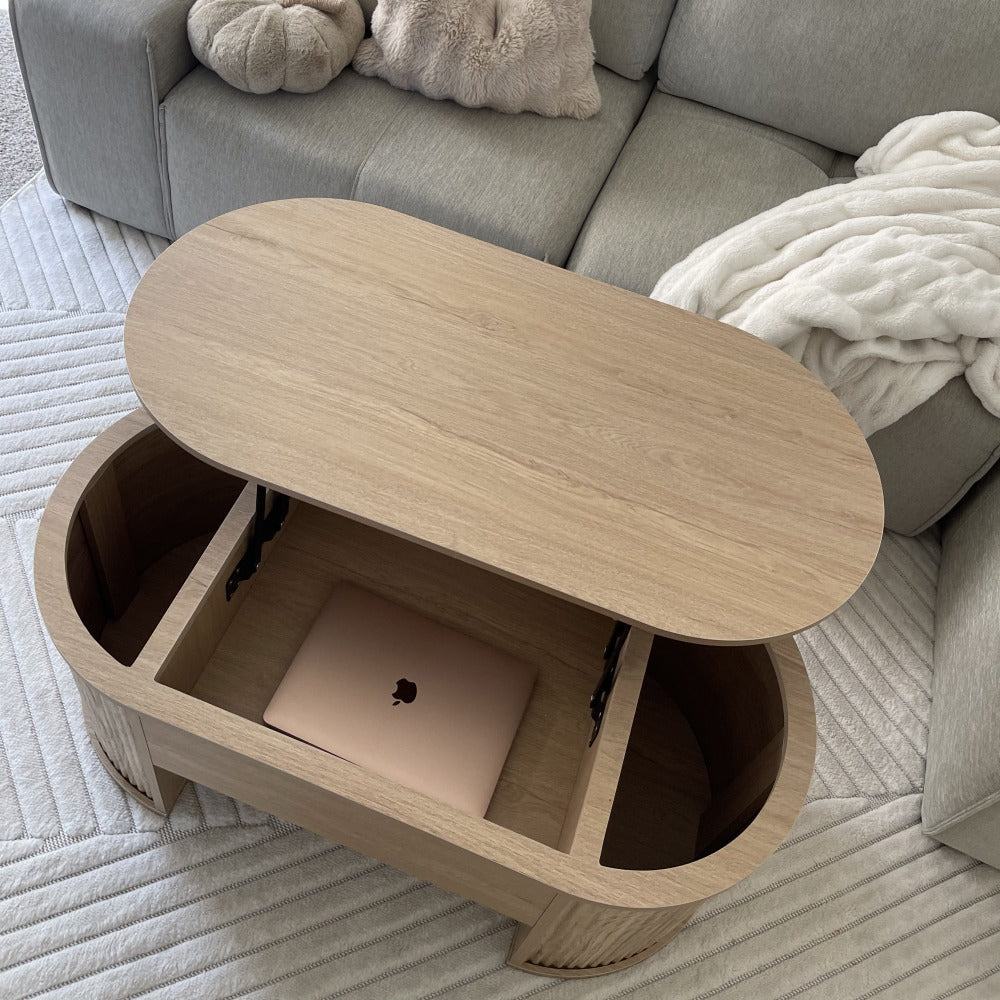 Elevate your living room with this mid‑century inspired oval coffee table featuring a stylish fluted wood design and a smooth lift‑top surface for easy access to hidden storage. With plenty of space to store blankets, magazines, remotes, and everyday clutter, it keeps your space tidy and functional. Built with a stable frame and versatile design, it works perfectly as a coffee table, work surface, or casual dining spot — ideal for modern, farmhouse, or small‑space interiors.